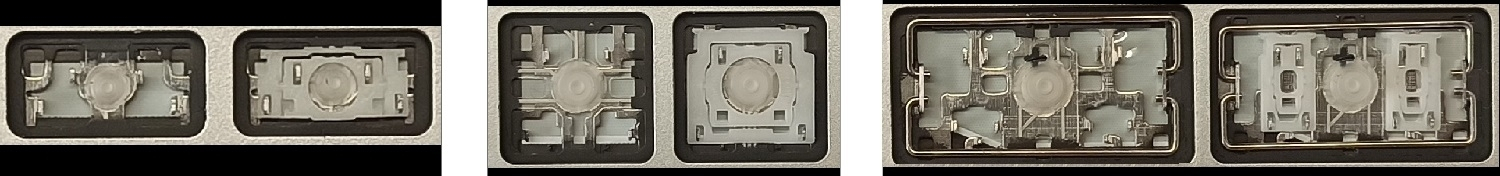 - Pour choisir le modèle approprié, comparez l’emplacement vide de votre clavier avec les photos ci-dessous, ou retirez la touche « A » : vous trouverez toujours sous celle-ci une articulation de taille moyenne.